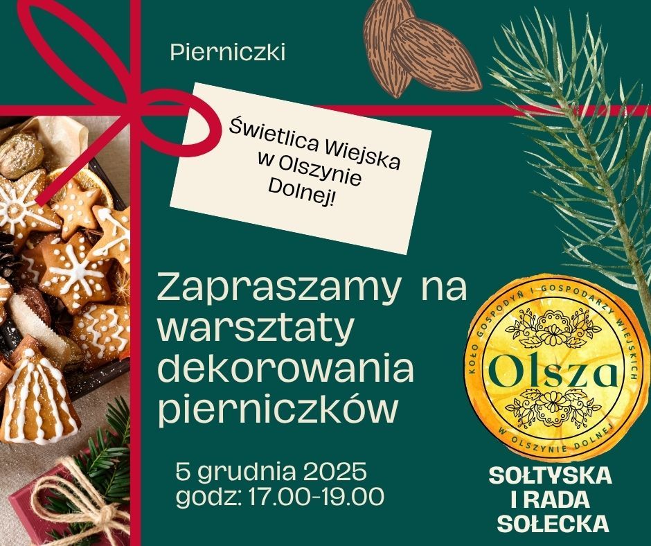 Sołtys Olszyny Dolnej Marta Foszcz-Marciniak wraz z Radą Sołecką mają przyjemność zaprosić dzieci na magiczny wieczór, w trakcie którego odbędą się zajęcia z dekorowania pierniczków. Odbędzie się on w piątek 5 grudnia br. Start o godzinie 17.