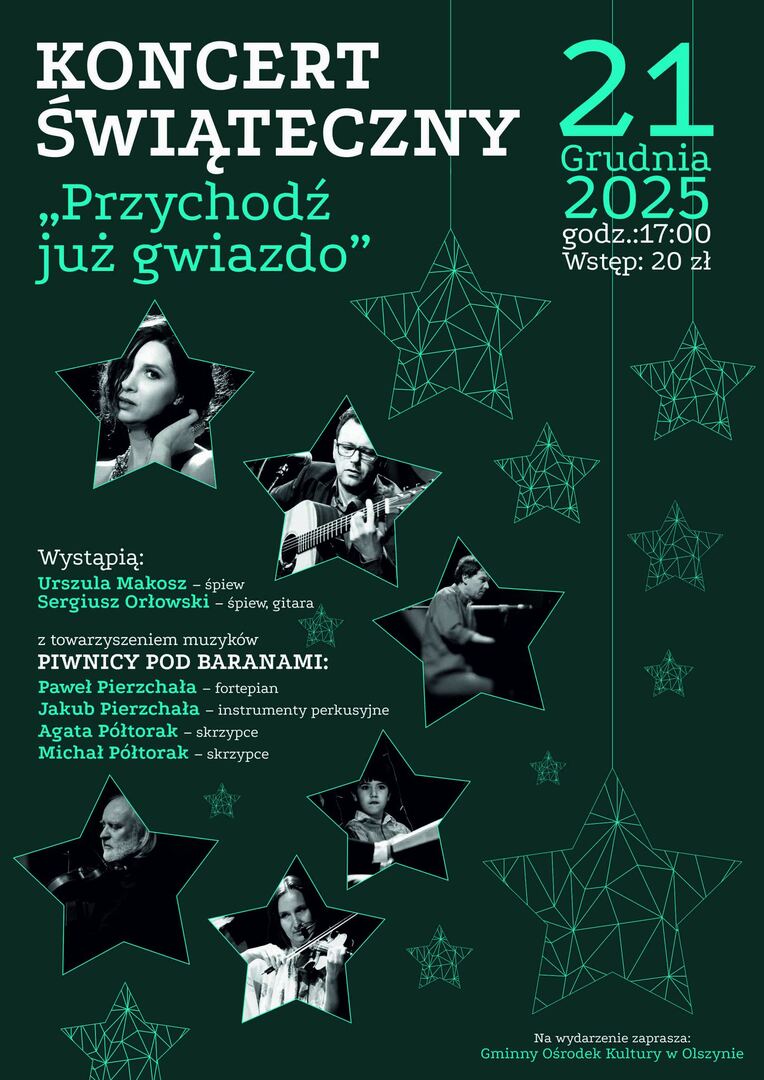 W przedświąteczną niedzielę 21 grudnia br. w sali widowiskowej Gminnego Ośrodka Kultury w Olszynie, odbędzie się wyjątkowy koncert pt. „Przychodź już, gwiazdo”, z udziałem muzyków słynnej krakowskiej „Piwnicy pod Baranami”.